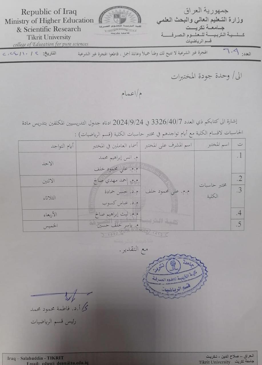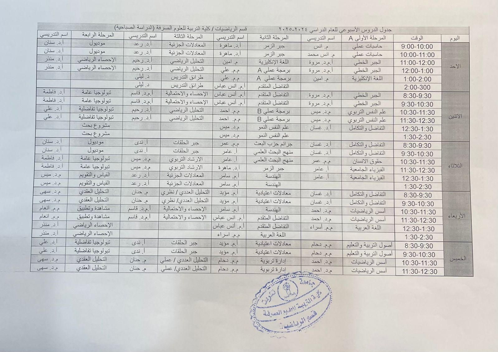جدول الدروس الاسبوعي الدراسات العليا ماجستير قسم الرياضيات ( أضغط هنا )