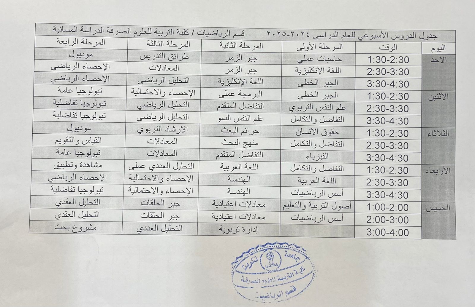 جدول الدروس الاسبوعي الدراسة المسائية للعام الدراسي 2024-2025
